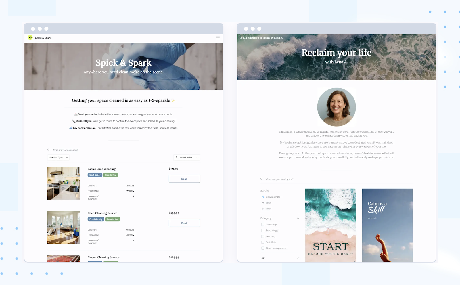 This easy-to-use template is perfect for cleaning businesses (or any service-based business) looking to create a company website. It highlights the range of services you offer, making it simple for potential clients to browse, contact you, or book appointments – all in just a few clicks.