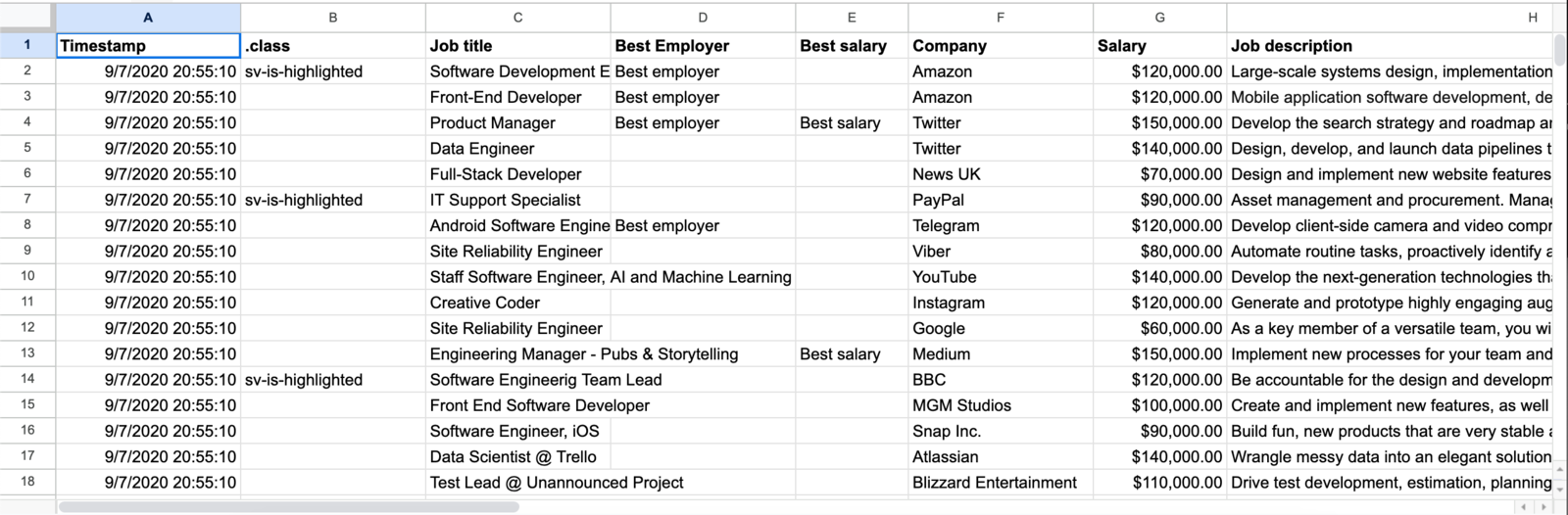 SpreadSimple offers easy integration with third-party service providers like Google Forms to help you embed a form onto your job board website. If you sync this form with your Google Sheet, every time an applicant fills it out, there will be a new submission on your website. Its templates also compile the data logically and simply and display important information, such as job description, salary range, skills required, website link, etc.