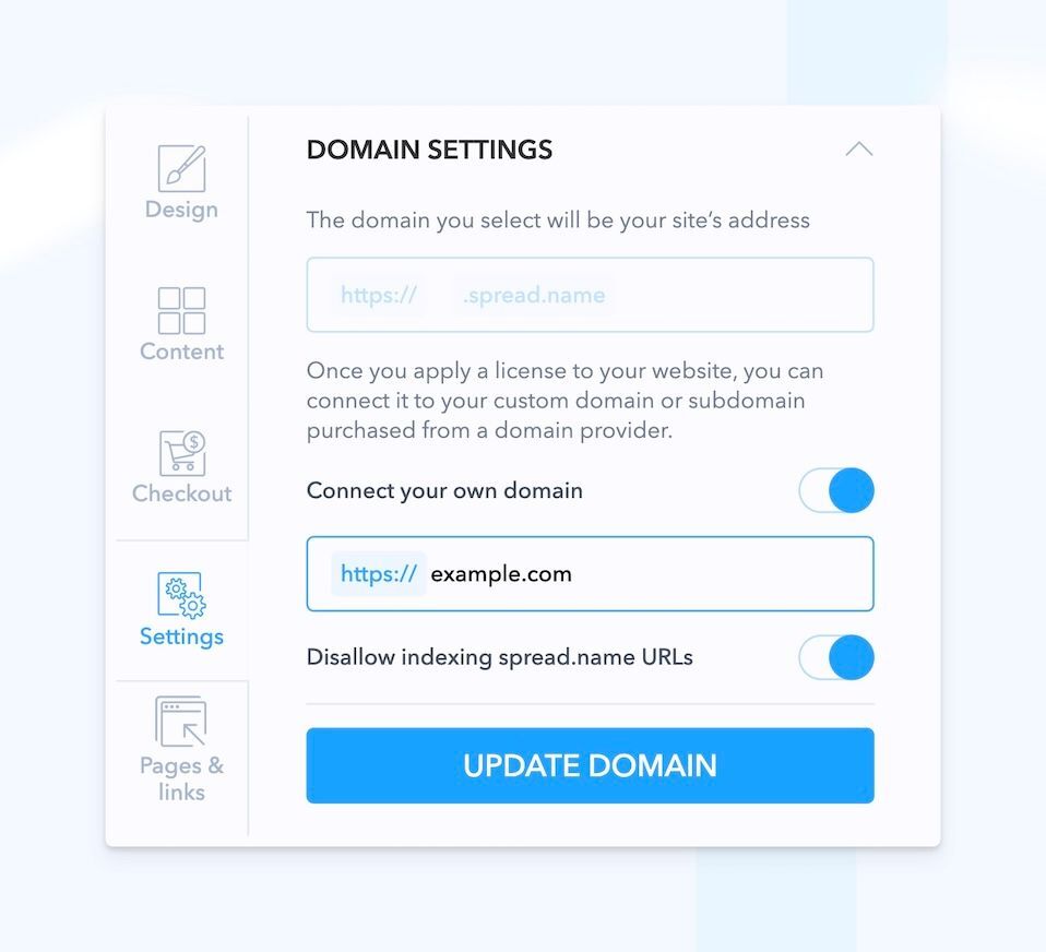 In addition, if you've connected a custom domain to your site, there's a new option available for you. Simply switch on the Disallow indexing spread.name URLs toggle to prevent any of your spread.name links from being indexed by search engines. This ensures that only your custom domain URLs is indexed, avoiding any potential SEO issues caused by accidental indexing of default spread.name URLs.