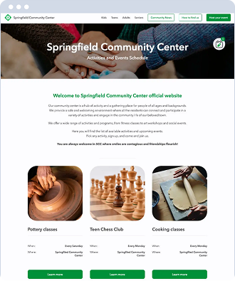 Simply choose a community center template or use AI to create a feature-rich website in a matter of just a few hours. The spreadsheet works as a content management system (CMS) for the platform, which means you can update your service information in just a few clicks by editing your sheet.