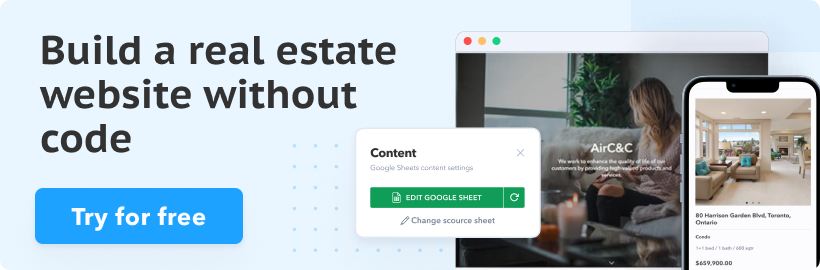It is possible to build a real estate website in minutes using SpreadSimple, a no-code website builder powered by Google Sheets. With this browser app, a regular spreadsheet becomes your website’s content management system, so updating the listings on the platform will be a piece of cake. In the Google sheet, you can store all the data you need, edit it, and pick the listings you want to appear on the website. Using the same document, you can also add the virtual tour to the site via a link or HTML code.